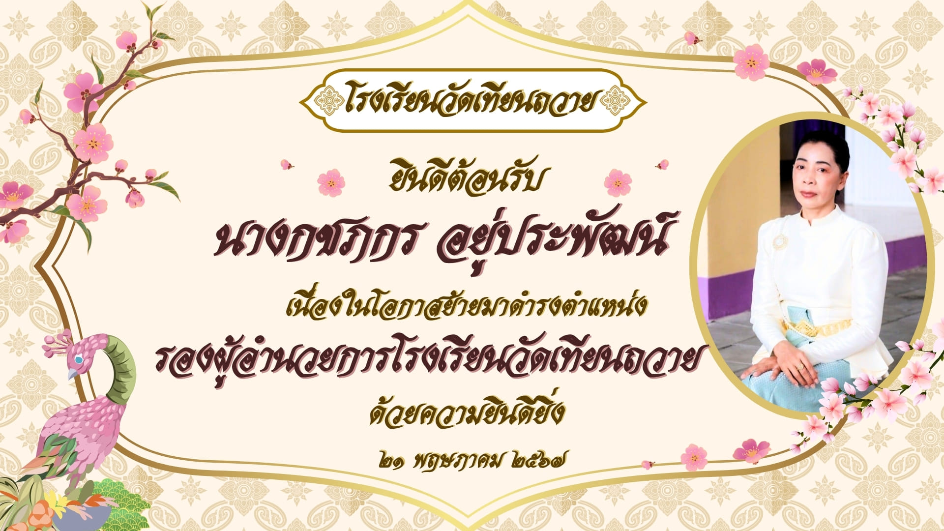 ยินดีต้อนรับ นางกชภกร อยู่ประพัฒน์ เนื่องในโอกาสย้ายมาดำรงตำแหน่งรองผู้อำนวยการโรงเรียนวัดเทียนถวาย