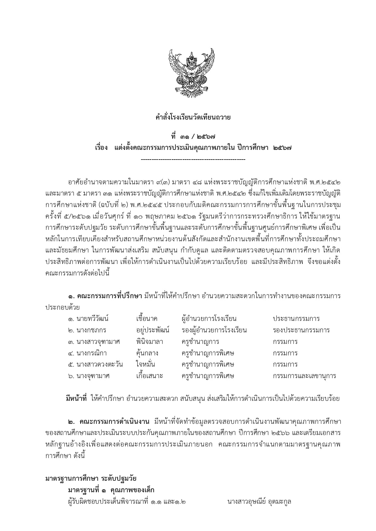 ประกาศโรงเรียนวัดเทียนถวาย เรื่อง แต่งตั้งคณะกรรมการประเมินคุณภาพภายใน ปีการศึกษา ๒๕๖๗