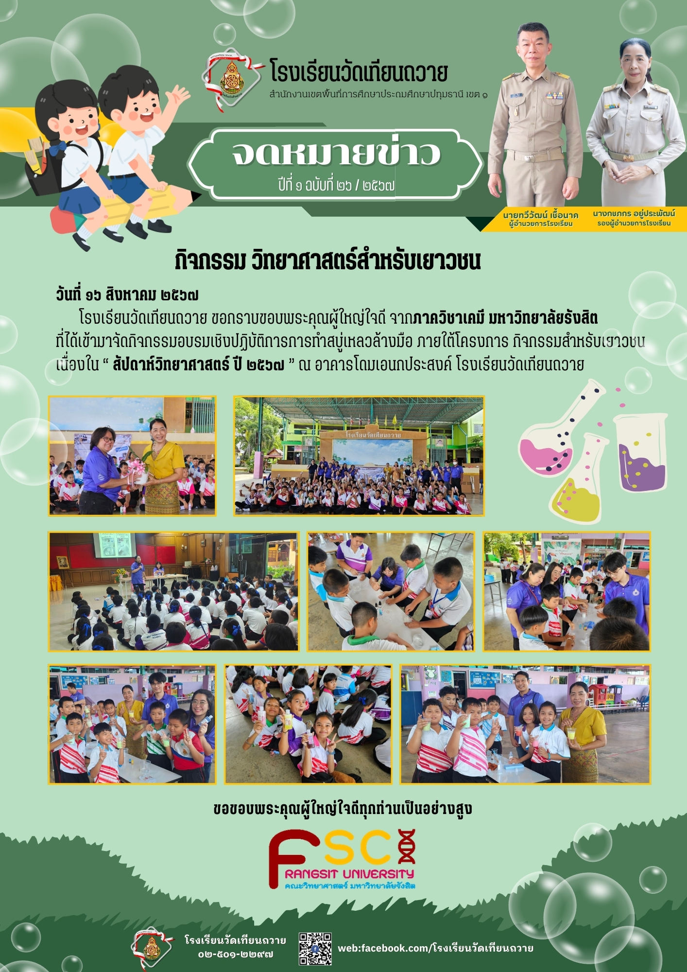 โรงเรียนวัดเทียนถวาย ขอกราบขอบพระคุณผู้ใหญ่ใจดี จากภาควิชาเคมี มหาวิทยาลัยรังสิต