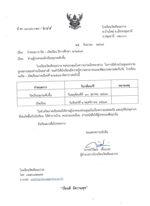 กำหนดการปิดภาคเรียนที่1/2567 และกำหนดการเปิดภาคเรียนที่2/2567