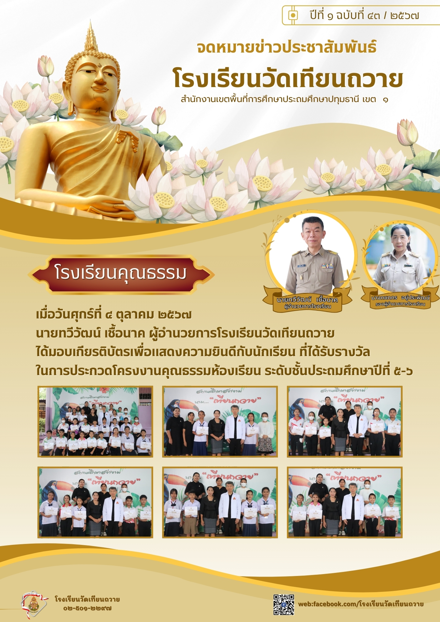 นายทวีวัฒน์ เชื้อนาค ผู้อำนวยการโรงเรียนวัดเทียนถวาย ได้มอบเกียรติบัตรเพื่อแสดงความยินดีกับนักเรียน